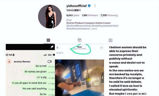 据报道,在2024年7月,杰瑞米·雷纳和周依合作过纪录片《ChroniclesofDisney》和动画片《StardustFuture》。 周依在本周早些时候通过社交媒体发声, 指控雷纳自六月起 通过Instagram和WhatsApp向她发送多私密照片, 并称自己单身很久,希望能找到建立认真关系的人,极力说服她交往。